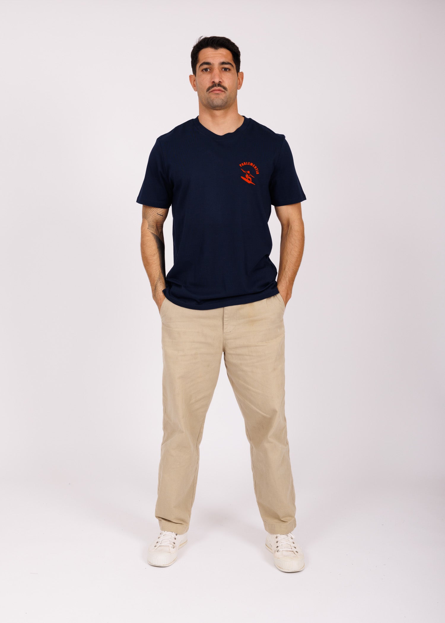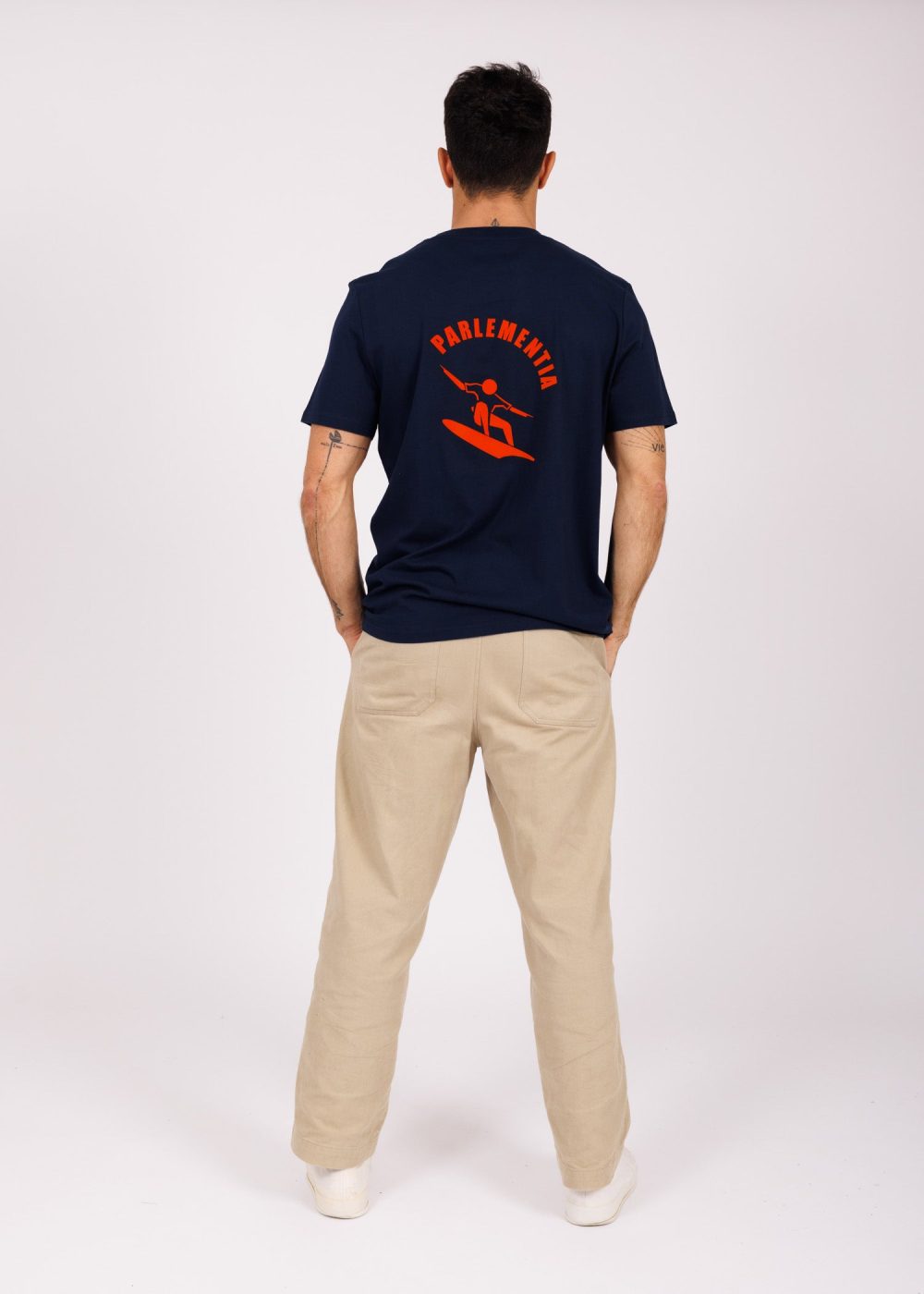 Tee-shirt homme col rond en coton biologique marine, floqué de notre logo Fingers en orange sur le coeur et le dos.